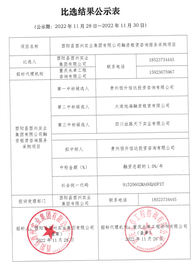 酉陽縣酉州實業(yè)集團有限公司融資租賃咨詢服務采購項目比選結果公示表